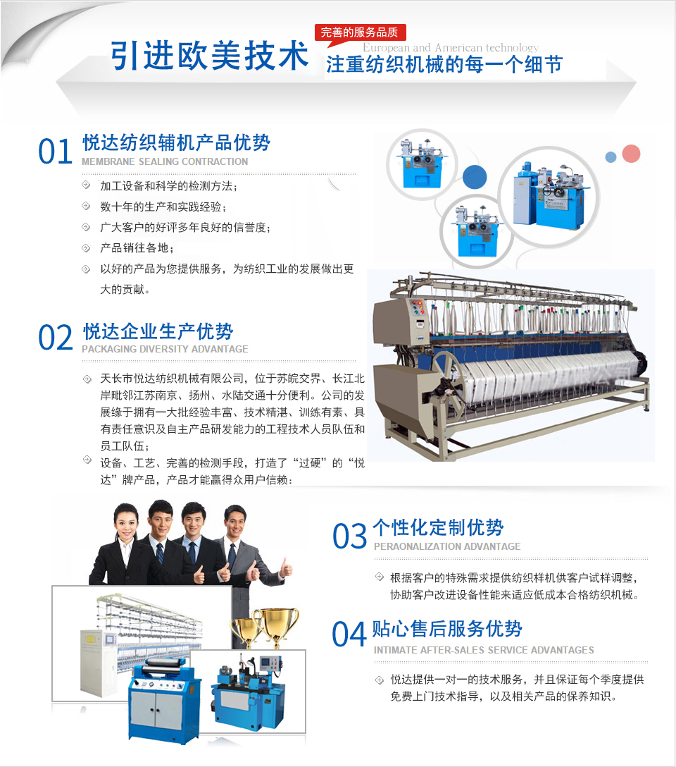 公司是主要生產(chǎn)紡織平車安裝工具、紡部輔件及配件綜合性企業(yè)。已有二十多年的生產(chǎn)歷史,在激烈的市場競爭中始終保持優(yōu)良的質(zhì)量、優(yōu)化的價(jià)格、齊全的品種優(yōu)勢(shì)。產(chǎn)品暢銷全國各地,深受新老客戶的好評(píng)。